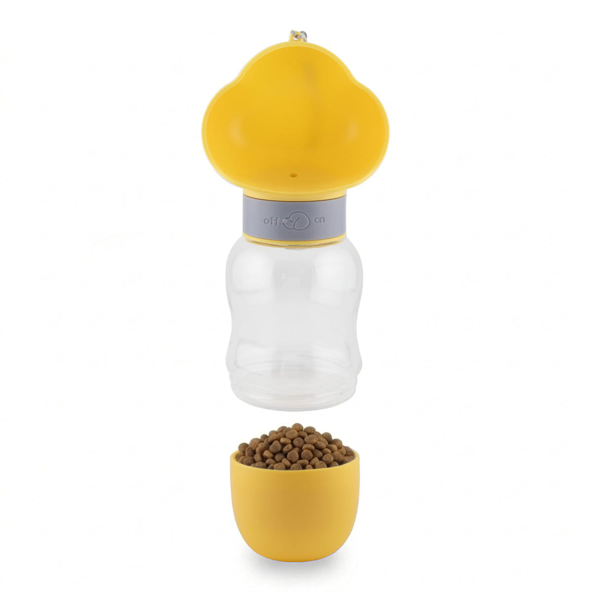 Dolna część butelki to szczelny schowek na suchą karmę lub ulubione przysmaki. To świetne rozwiązanie na dłuższe spacery, treningi i wyjazdy.