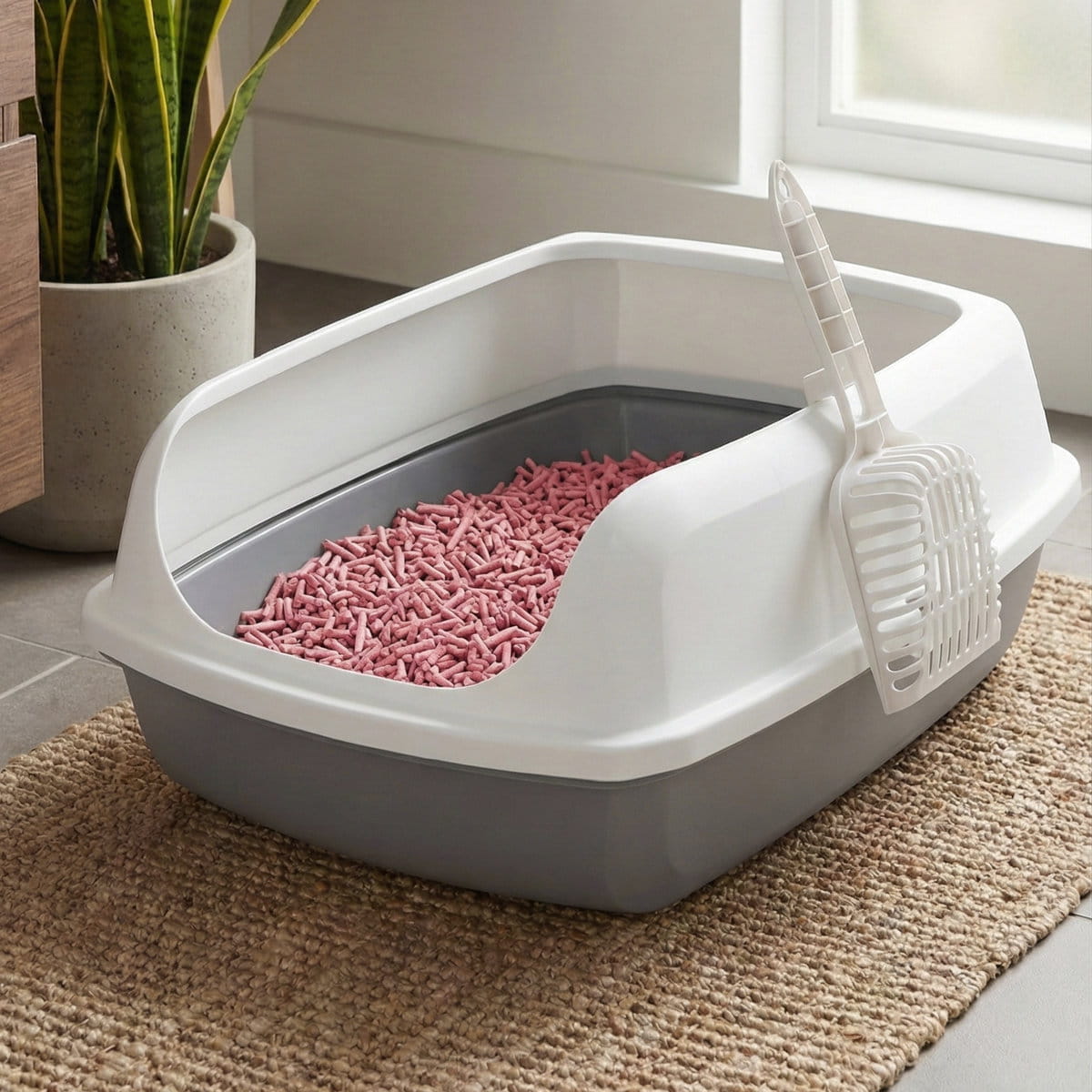 - Antypoślizgowa Podstawa: Kuweta posiada antypoślizgowe nóżki, które zapobiegają przesuwaniu się podczas użycia, co zapewnia stabilność i wygodę dla kota