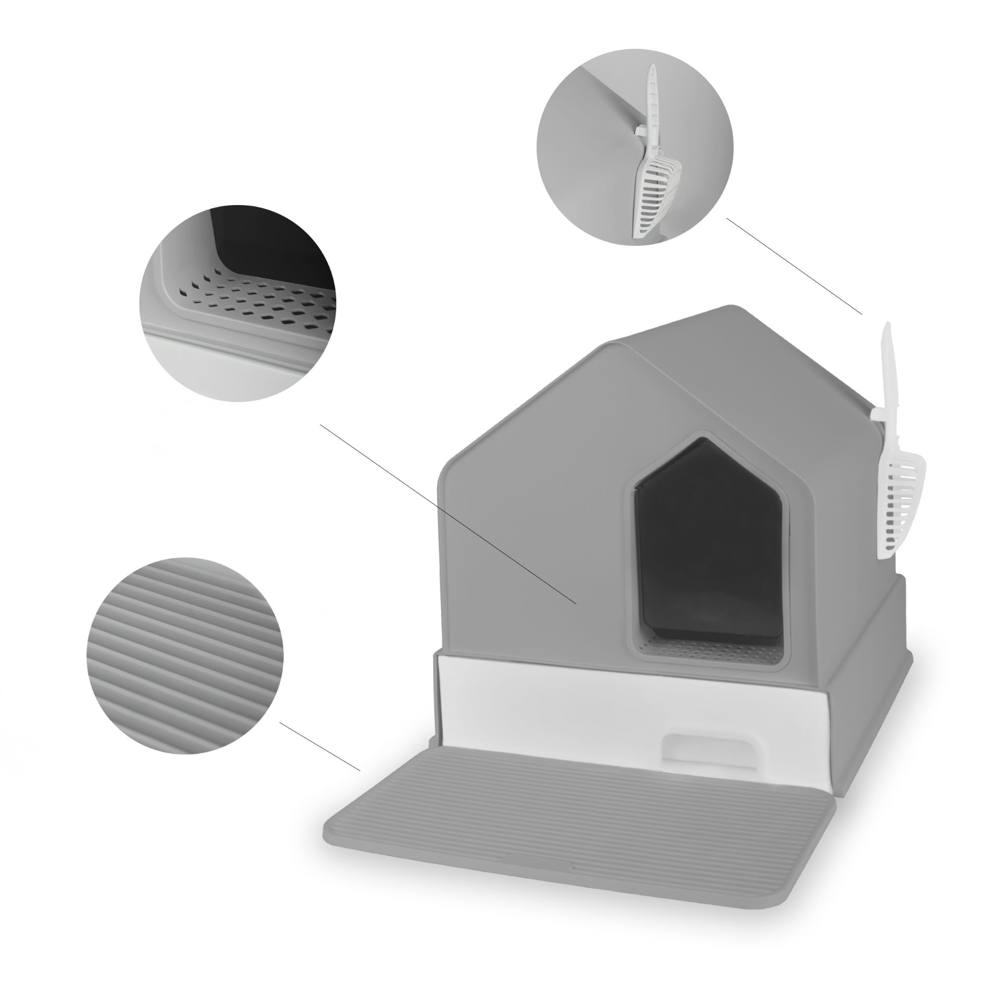 Dolną część domku stanowi szuflada pozwalająca na łatwe usuwanie nieczystości ze żwirku i jego wymianę - w zestawie znajduje się również łopatka mocowana na bocznej ściance. Przestronne wnętrze umożliwia komfortowe korzystanie podczas załatwiania potrzeb.