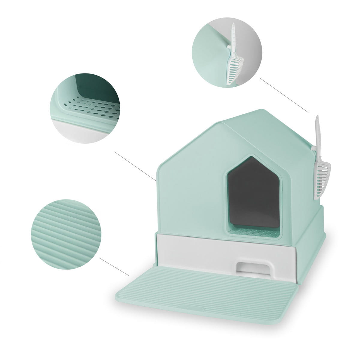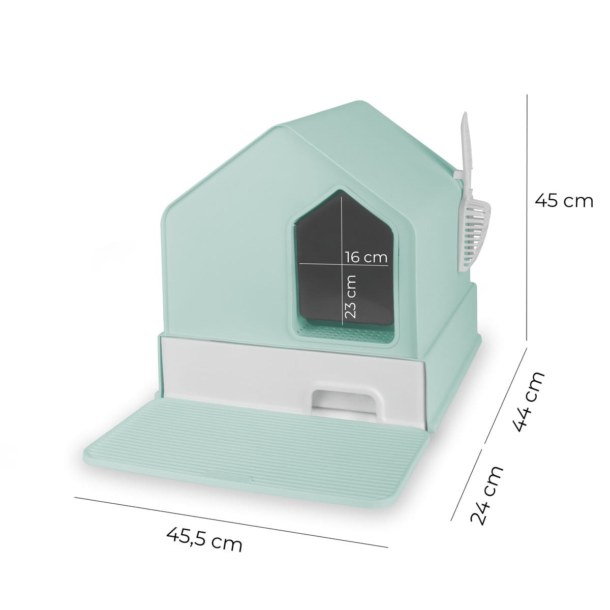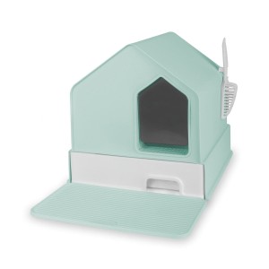 Dolną część domku stanowi szuflada pozwalająca na łatwe usuwanie nieczystości ze żwirku i jego wymianę - w zestawie znajduje się również łopatka mocowana na bocznej ściance. Przestronne wnętrze umożliwia komfortowe korzystanie podczas załatwiania potrzeb.
