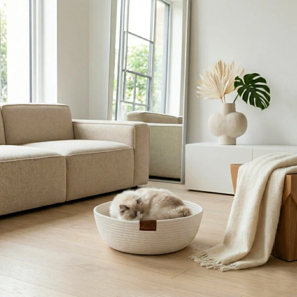 Miękka, a jednocześnie stabilna forma zapewnia zwierzęciu komfortowy odpoczynek i poczucie bezpieczeństwa. Podwyższone brzegi delikatnie otulają pupila, tworząc przytulną przestrzeń idealną do snu i relaksu. Naturalna bawełna jest bezpieczna dla użytkownika, przewiewna i przyjemna w dotyku.