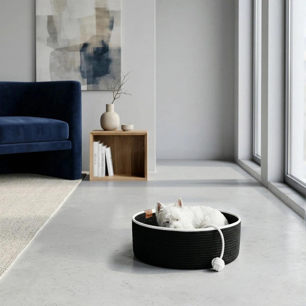 Całość dopełnia stylowy, skórzany element dekoracyjny, który nadaje legowisku wyjątkowego charakteru i podkreśla jego nowoczesny, minimalistyczny styl. To detal, który sprawia, że produkt pięknie prezentuje się w każdym wnętrzu – od klasycznego po loftowe.