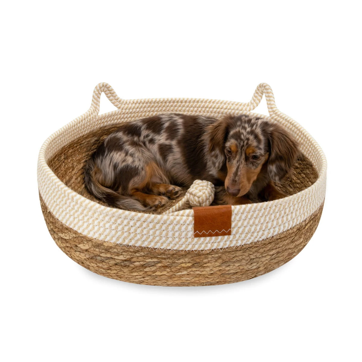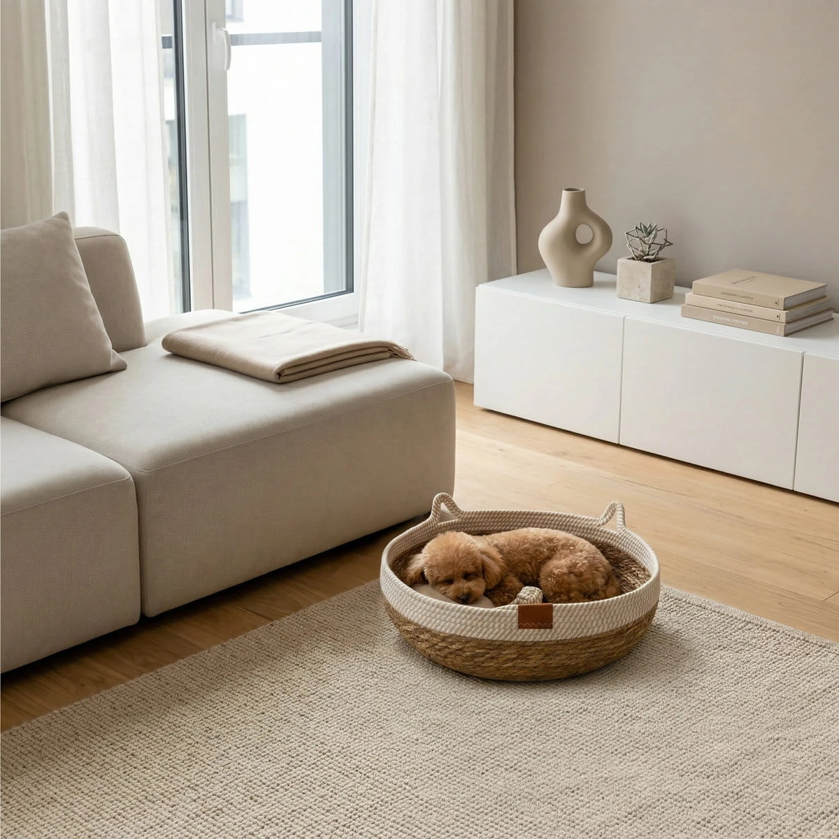 Pleciona struktura zapewnia dobrą cyrkulację powietrza, dzięki czemu legowisko sprawdza się zarówno w domu, jak i na zadaszonym tarasie czy balkonie. Legowisko w kształcie misy wyróżnia się solidną konstrukcją zapewniającą odpowiednie podparcie i miękkość. To praktyczne rozwiązanie będące modną dekoracją Twojego wnętrza dostępne w dwóch kolorach.