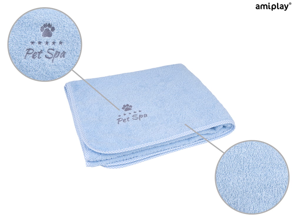 Kolekcja amiplay Spa to gama różnorodnych, funkcjonalnych produktów, które pozwolą stworzyć komplety akcesoriów kąpielowych, dostosowane do indywidualnych potrzeb. Warto pozwolić sobie na odrobinę luksusu tworząc domowy salon piękności dla swojego czworonożnego przyjaciela. Produkty tej serii są bardzo chłonne i przyjemne w dotyku dla zapewnienia komfortu. Stonowana, pastelowa kolorystyka, będzie się doskonale prezentować w każdej łazience. Bawełniana tkanina nie powoduje podrażnień, ani uczuleń. Jednocześnie jej odświeżenie jest bardzo łatwe, ponieważ może być ona prana w pralce w wyższych temperaturach, aby znów była gotowa do bezpiecznego użycia.