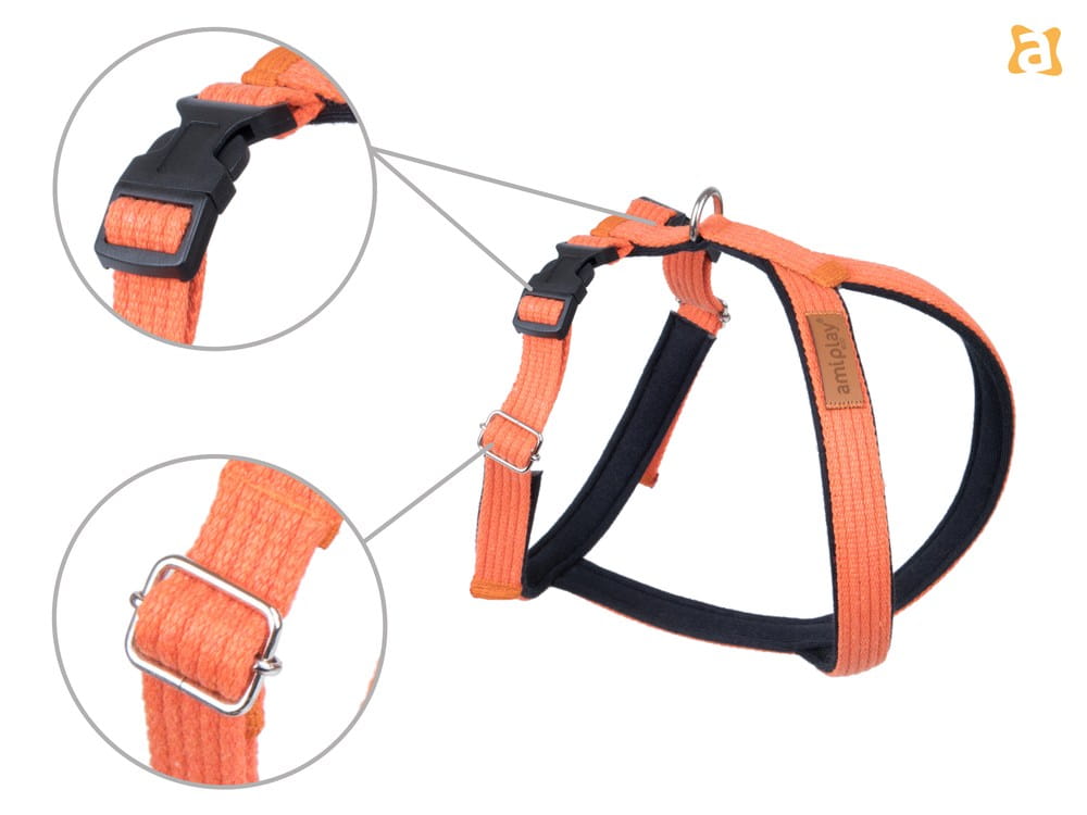 Wykonane są z bardzo wytrzymałej, ekologicznej taśmy bawełnianej produkowanej specjalnie dla firmy amiplay. Jest ona miękka i przyjemna w dotyku. Dla większego komfortu taśma jest podszyta gąbką z welurem, dzięki czemu nie ma ryzyka powstania otarć nawet przy intensywnym użytkowaniu. Dodatkowo z łatwością można je wyczyścić, ponieważ gdy tylko będzie taka potrzeba szelki można wyprać i znów są gotowe do użycia.