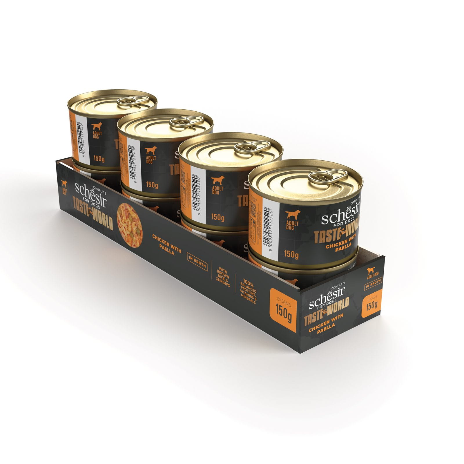 Brązowy ryż, krewetki, szynka i warzywa towarzyszą filetom z kurczaka: pełny i zbilansowany posiłek inspirowany słynną paellą, oferujący Twojemu psu wysoką jakość składników w pysznej kombinacji smaków.