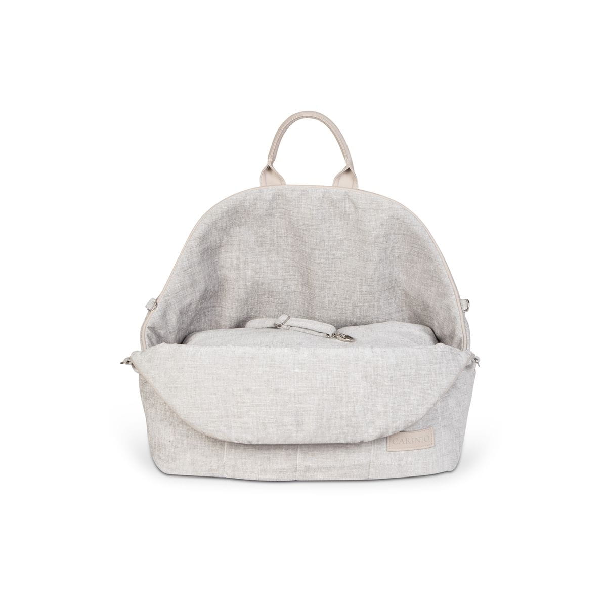 Beżowa naszywka z logo CARINIO, precyzyjne szycie i starannie dobrane, przyjazne zwierzętom materiały podkreślają luksusowy charakter torby. AMIS to produkt stworzony z myślą o trwałości, wygodzie i estetyce.