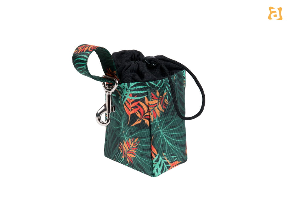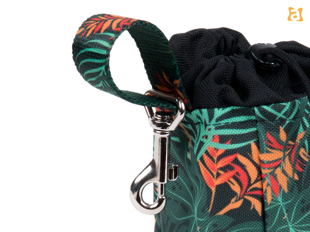 Torebka posiada szlufkę wraz z karabińczykiem, więc można przypiąć ją bezpośrednio do spodni bądź przewlec przez pasek. Aby uniknąć wysypywania się przysmaków albo chronić zawartość przed deszczem, wystarczy zamknąć saszetkę za pomocą ściągacza.