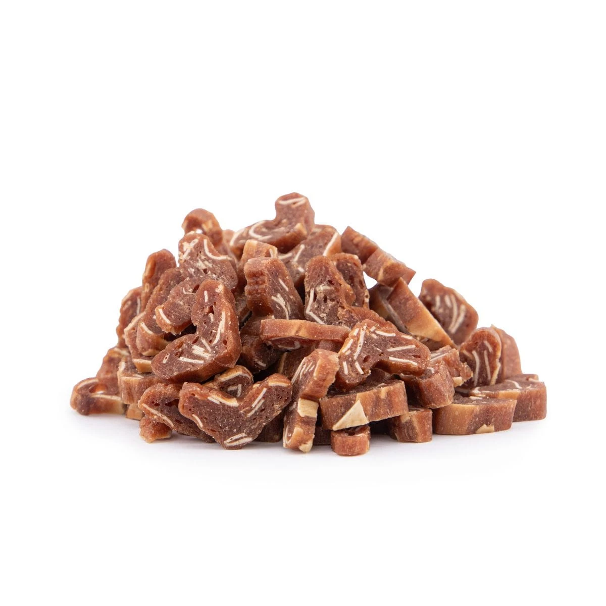 Połączenie delikatnej piersi z kaczki z dodatkiem dorsza zapewnia wyjątkową smakowitość oraz porcję białka, a urocza forma „serduszek” sprawia, że przekąska świetnie sprawdza się jako motywująca nagroda lub smaczne urozmaicenie codziennej diety psa.
